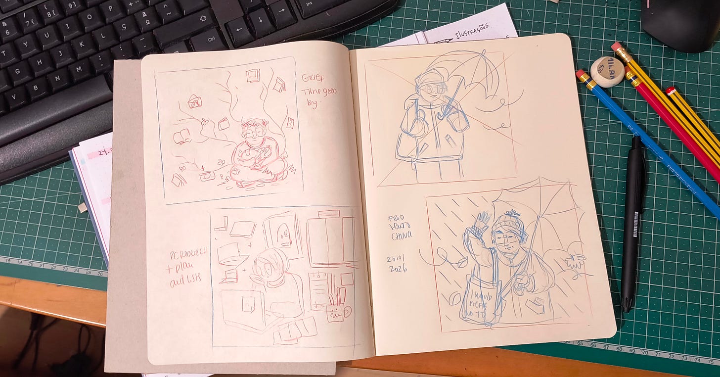 Para desenvolver estes desenhos semanais, começo por fazer um esboço tosco e experimental num sketchbook que tenho para o efeito. 10 Os desenhos finais são feitos num novo diário gráfico, num formato mais pequeno ao que estou habituada.11 A ideia era fazer um desenho por semana, mas em Janeiro acabei por fazer vários desenhos por cada semana. Podem espreitar no vídeo, ou em maior detalhe no Bites & Bits de Janeiro.12